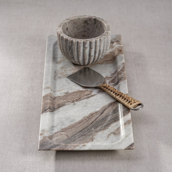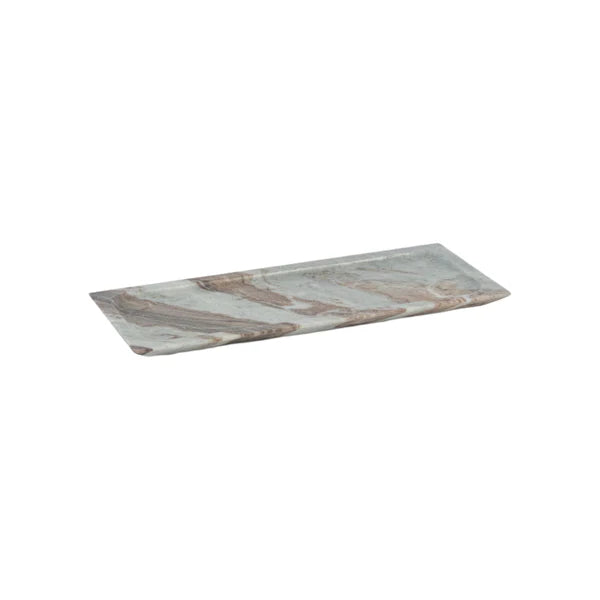 Elaborada con mármol de primera calidad, esta bandeja presenta una silueta rectangular única con elegantes bordes en relieve. Las vetas marrones le aportan carácter y sofisticación, convirtiendo cada bandeja en una obra de arte única. Ideal para servir aperitivos, bebidas o como elegante superficie de presentación, esta bandeja de mármol combina a la perfección funcionalidad y atractivo estético.