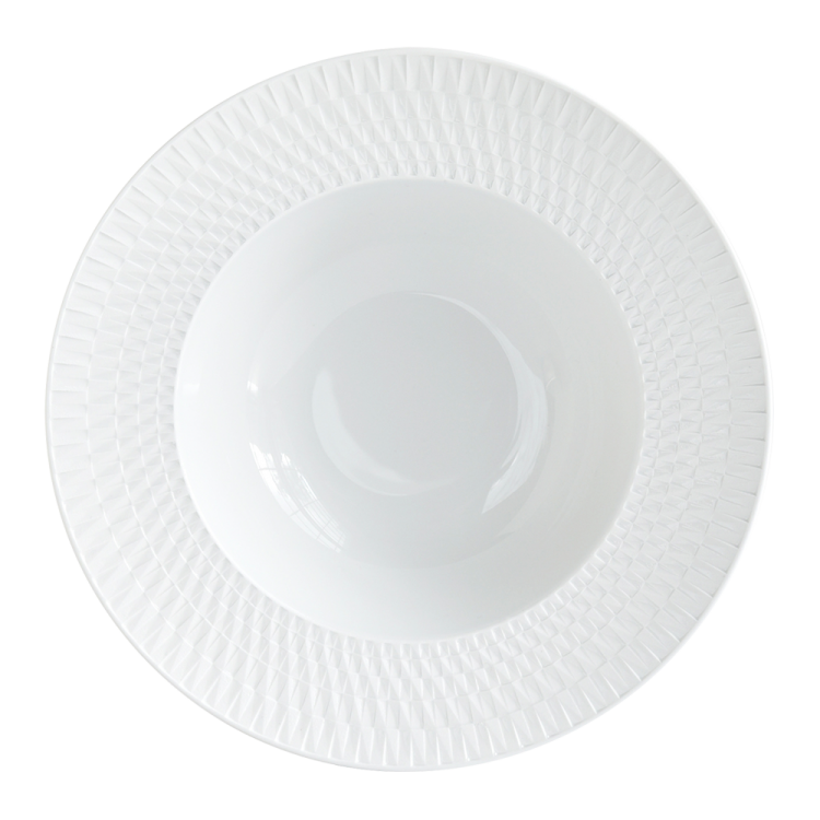 El delicado diseño de esta nueva colección combina diversas influencias: los efectos de luz de los biombos japoneses de papel de arroz, el arte del origami, el trenzado y el encordado de los muebles de los años 50, sin olvidar los gráficos 3D que ofrecen las nuevas tecnologías. El resultado es un sutil efecto sin precedentes de un patrón rigurosamente geométrico, tomado con un impulso retorcido. Grabado en el borde de los platos y en el exterior de las distintas piezas de la colección, es la luz la que revela la alternancia de acabados mate y brillante, creando un resplandor vibrante que realza la blancura de la porcelana.