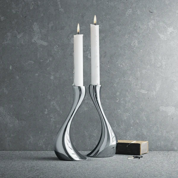 La forma se inspiró en parte en la idea de la cera derretida. La curva es tan orgánica que es casi como si un candelabro clásico hubiera empezado a derretirse. Su forma, con su dinámica espiral y su exterior de acero inoxidable, resulta seductora. La superficie de espejo capta y refleja la luz con elegancia.