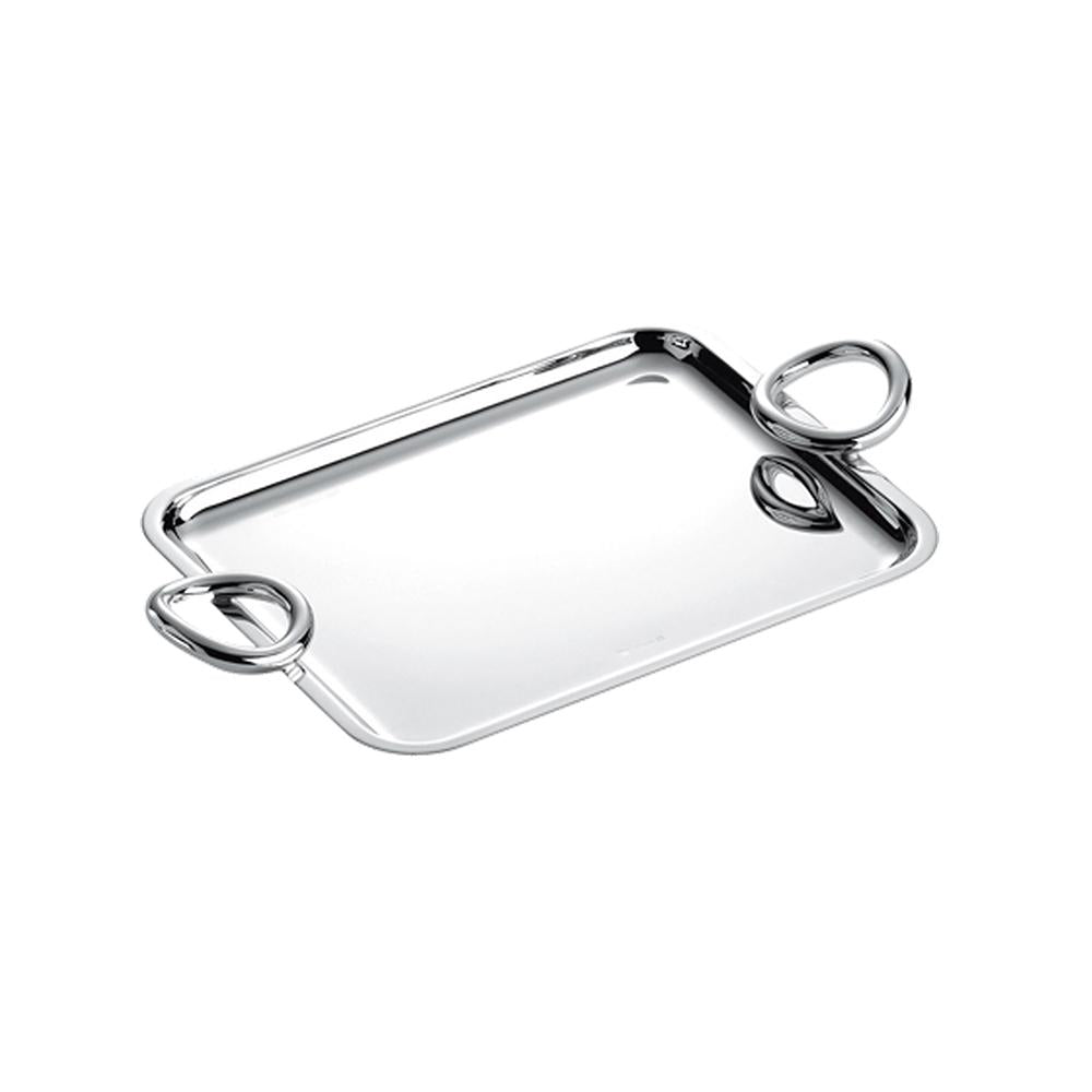 Elegante y moderna bandeja rectangular plateada con dos asas circulares.