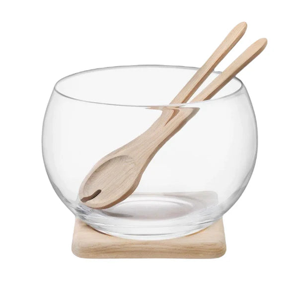Un gran cuenco de vidrio soplado con copas y una base hecha de roble de origen sostenible. El tablero de madera natural se puede tratar con aceites aptos para alimentos o dejar que madure y adquiera color de forma natural.
