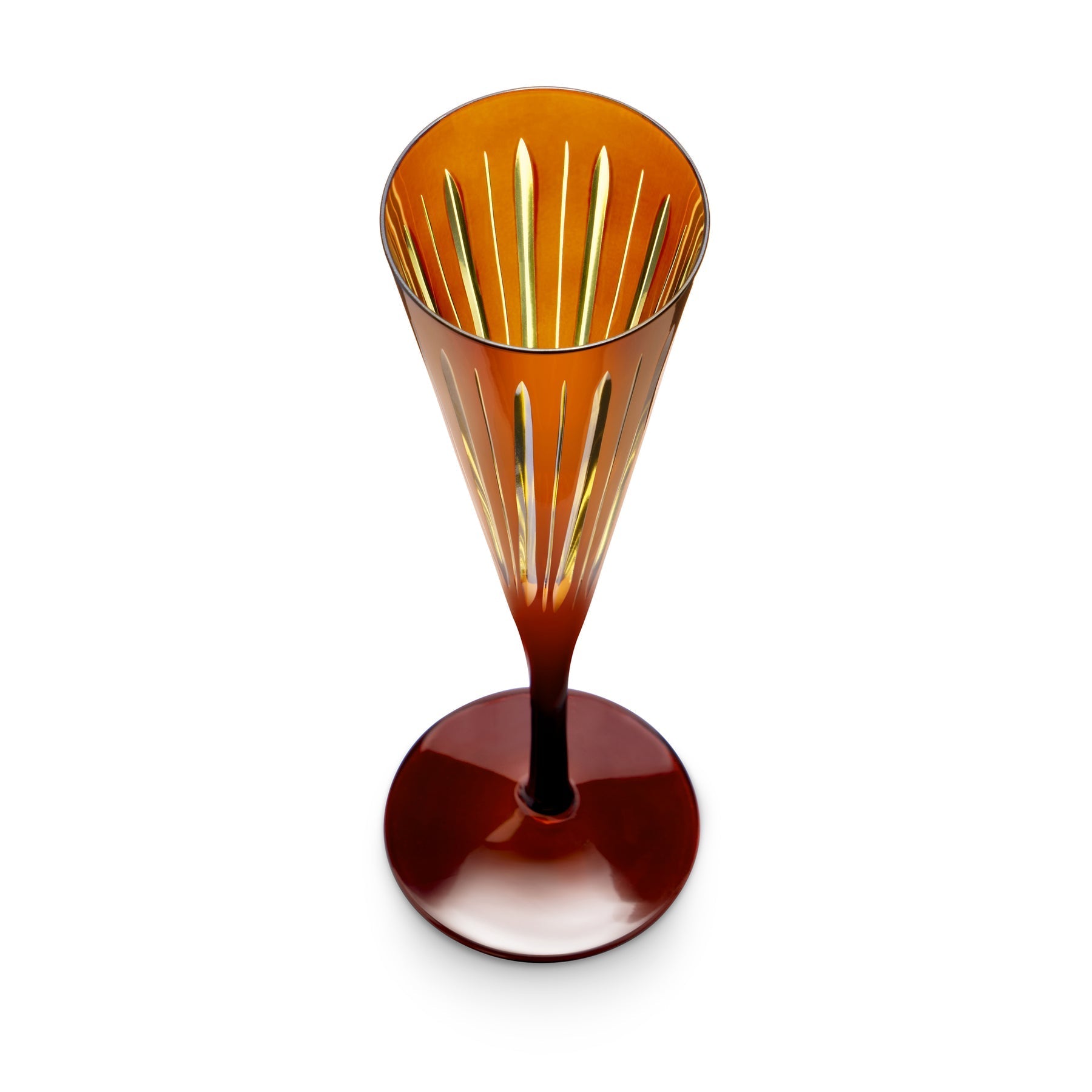 Copas de champagne elaboradas a mano con colores audaces, cortadas y decoradas para reflejar la luz de manera juguetona en vibrante Ámbar.