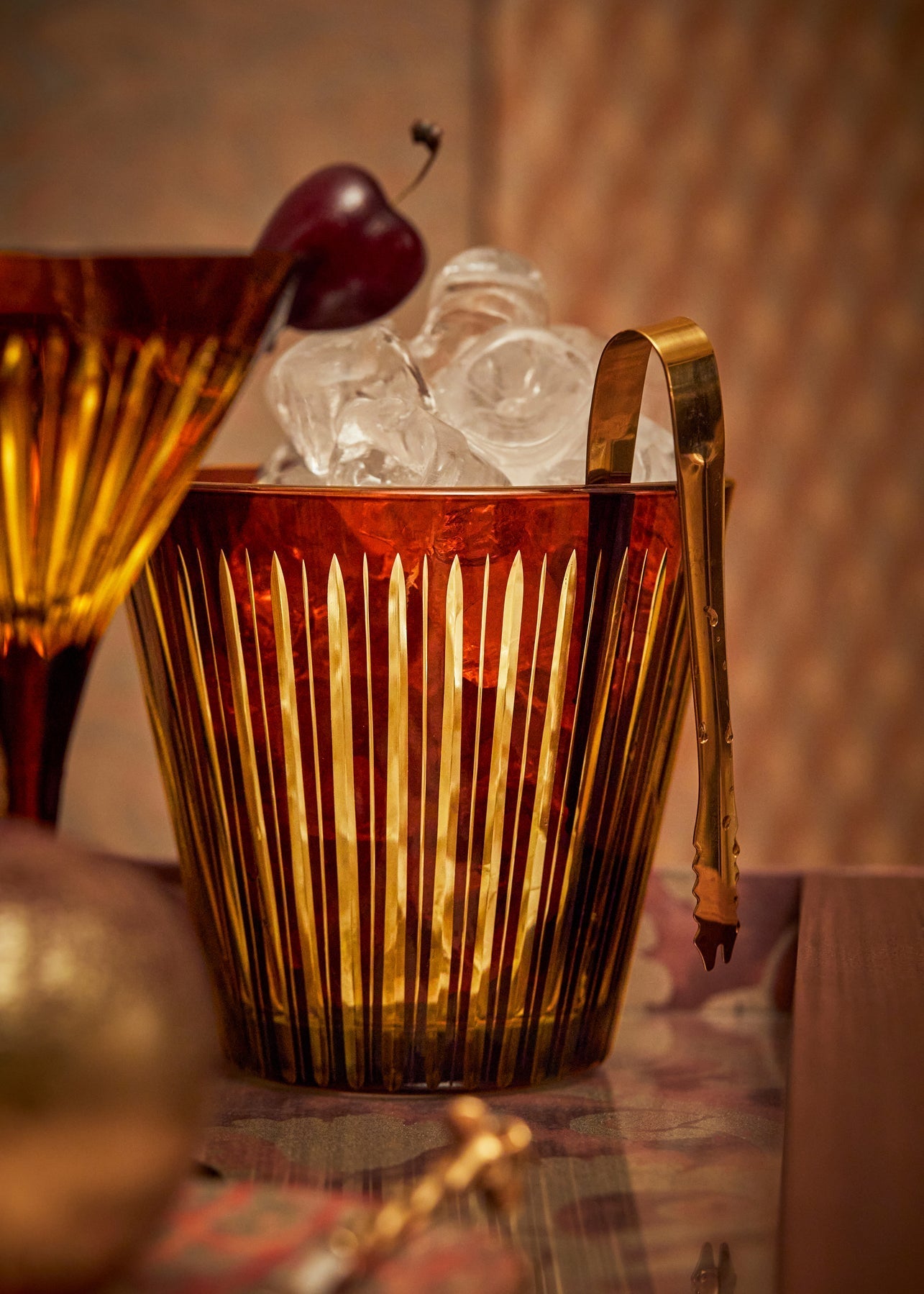 Cubitera con pinzas elaborada a mano, una pieza de exhibición que combina funcionalidad con elegancia visual en vibrante Ámbar.