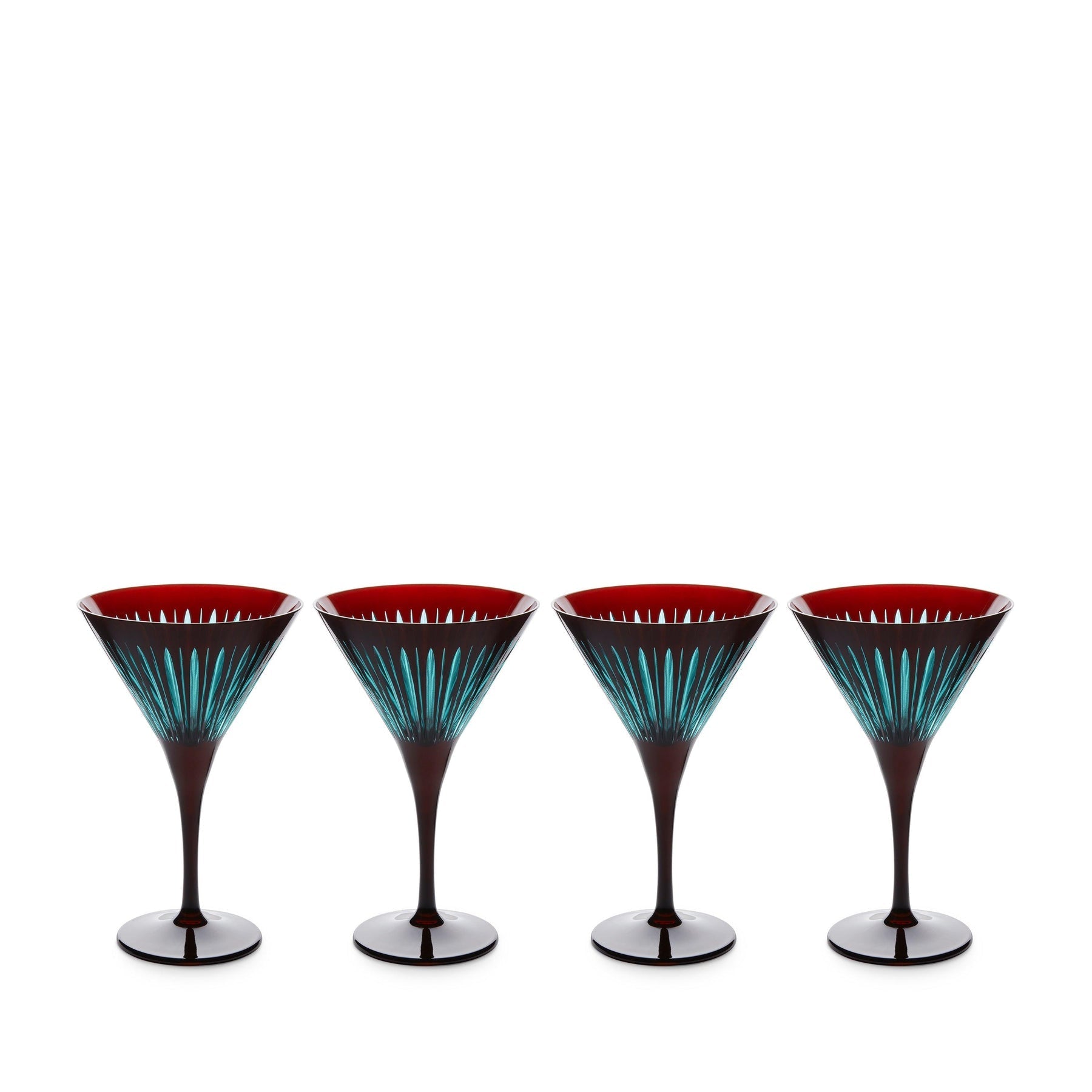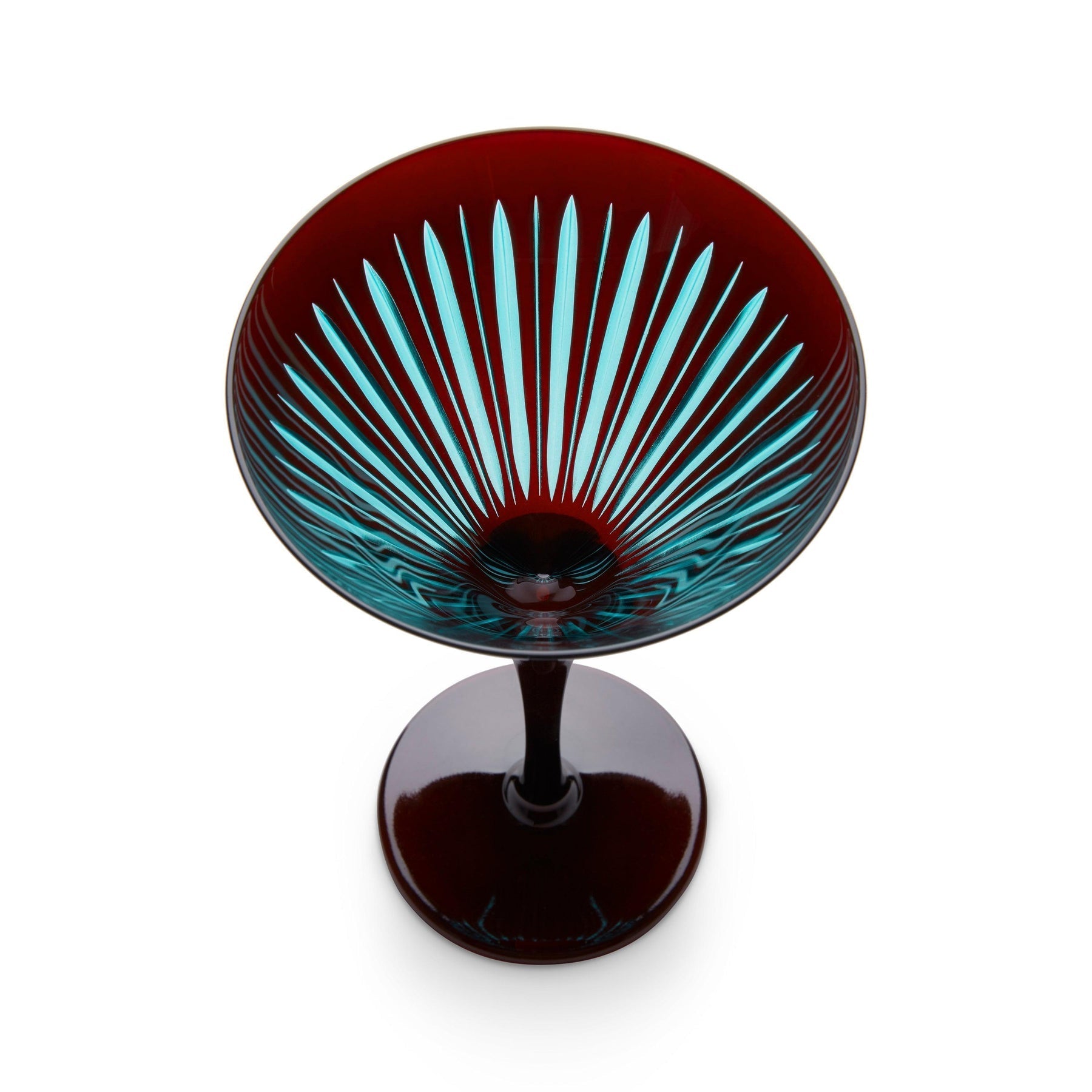Una colección de cristalería con combinaciones de colores audaces, cortada y decorada a mano para reflejar la luz de manera juguetona. Disponible en Ámbar, Verde, Púrpura y Surtido.