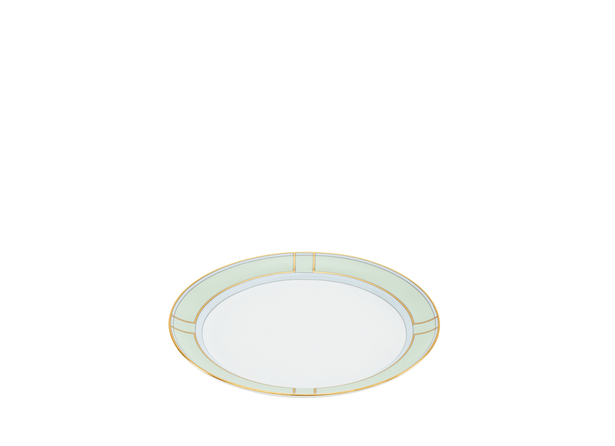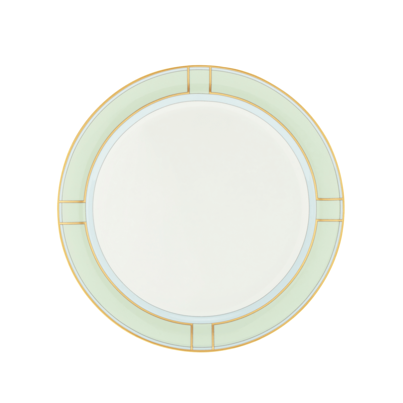 Fina porcelana decorada con motivos verdes y azul claro, y adornada con hilos dorados. Complementan los platos hondos, de pan y de postre de la misma colección, creando un servicio completo, apilable y fácil de guardar en espacios pequeños. Sus formas se inspiran en Colonna, una icónica colección de mediados de los años 50 del diseñador Giovanni Gariboldi, símbolo de funcionalidad y modernismo.
