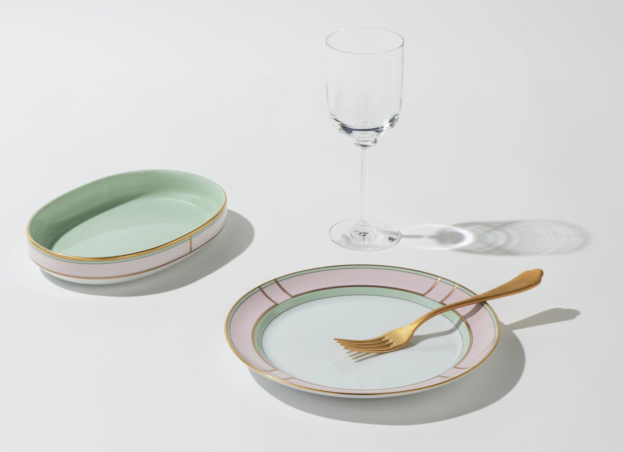 Diseño elegante, adornado con una decoración en rosa pálido y verde, y realzado con su característico hilo dorado. Complementan los platos hondos, de pan y de postre de la misma línea, especialmente al combinarse con los otros tres colores disponibles en ambientes vibrantes. Diva amplía la oferta de porcelana de Manifattura con una gama de vajilla y artículos de regalo con un diseño apilable, perfecto para espacios pequeños. Es un homenaje al diseño italiano de mediados de siglo, inspirado en la innovadora colección Colonna, que le valió a Giovanni Gariboldi el prestigioso premio Compasso d'Oro en 1954.